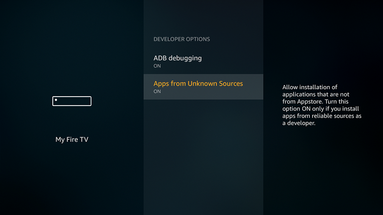 Open the settings of your Fire TV device, select My Fire TV - Developer Options and enable the Apps from Unknown Sources option.