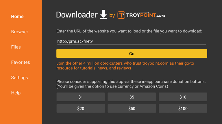 Open the app and enter the download url (e.g. http://prm.ac/firetv for our Premiumize.me app). The .apk file will download now.
